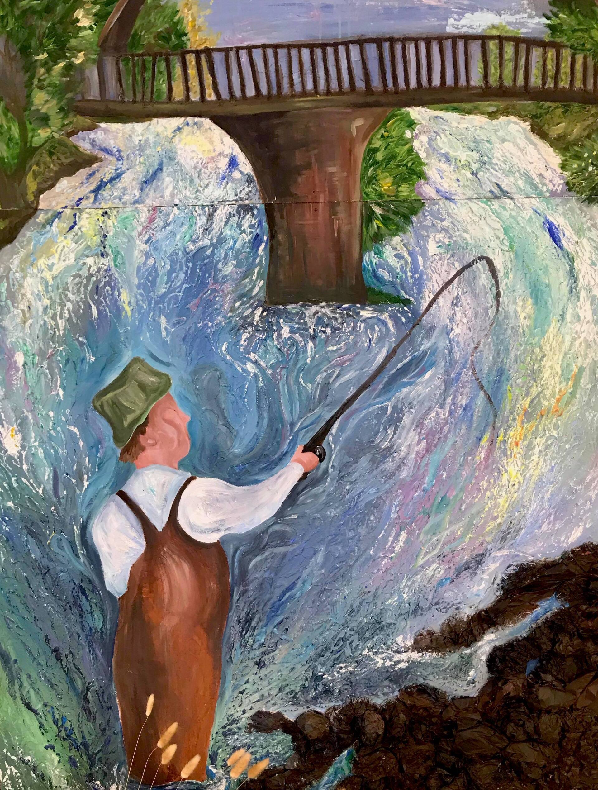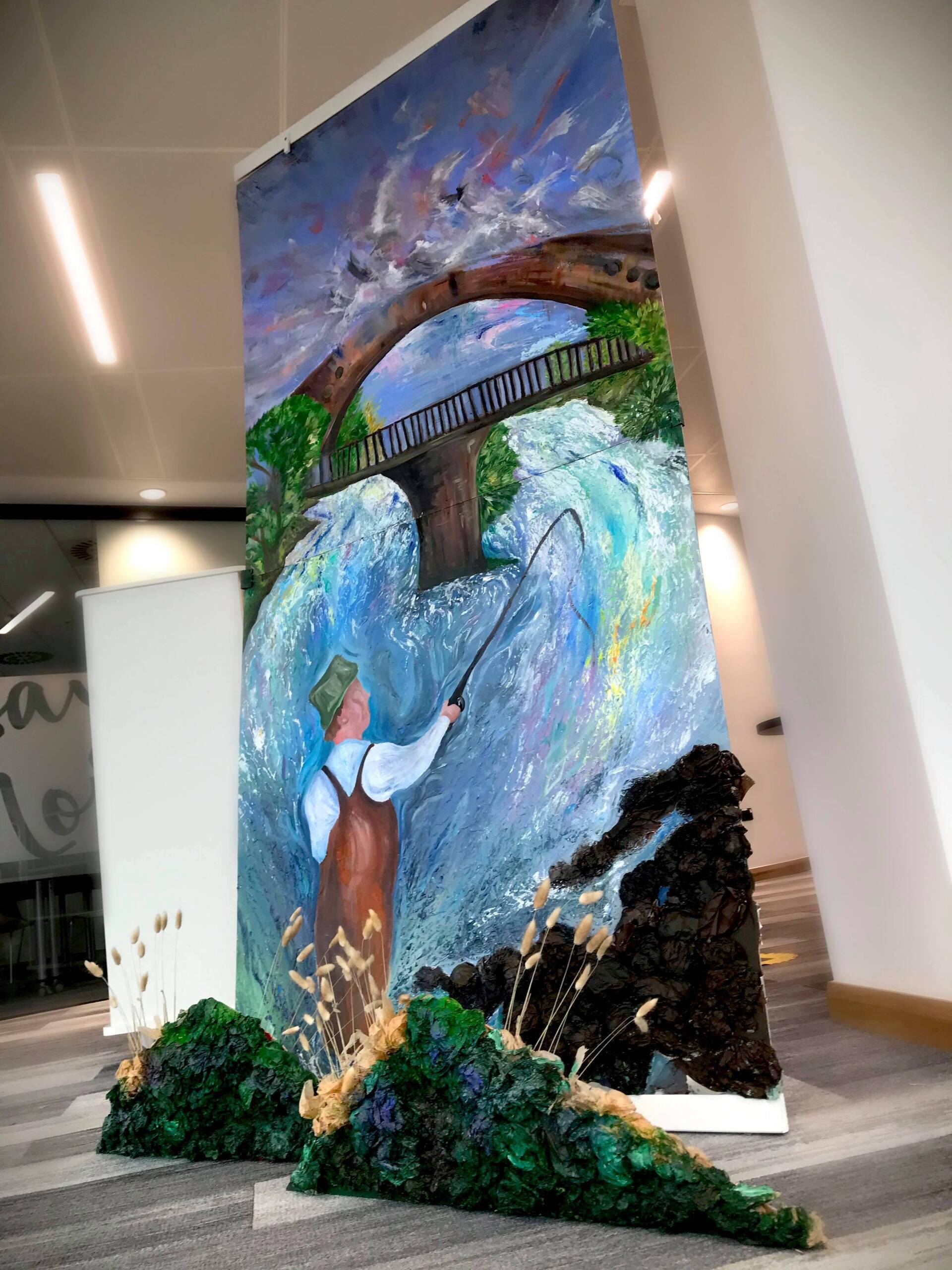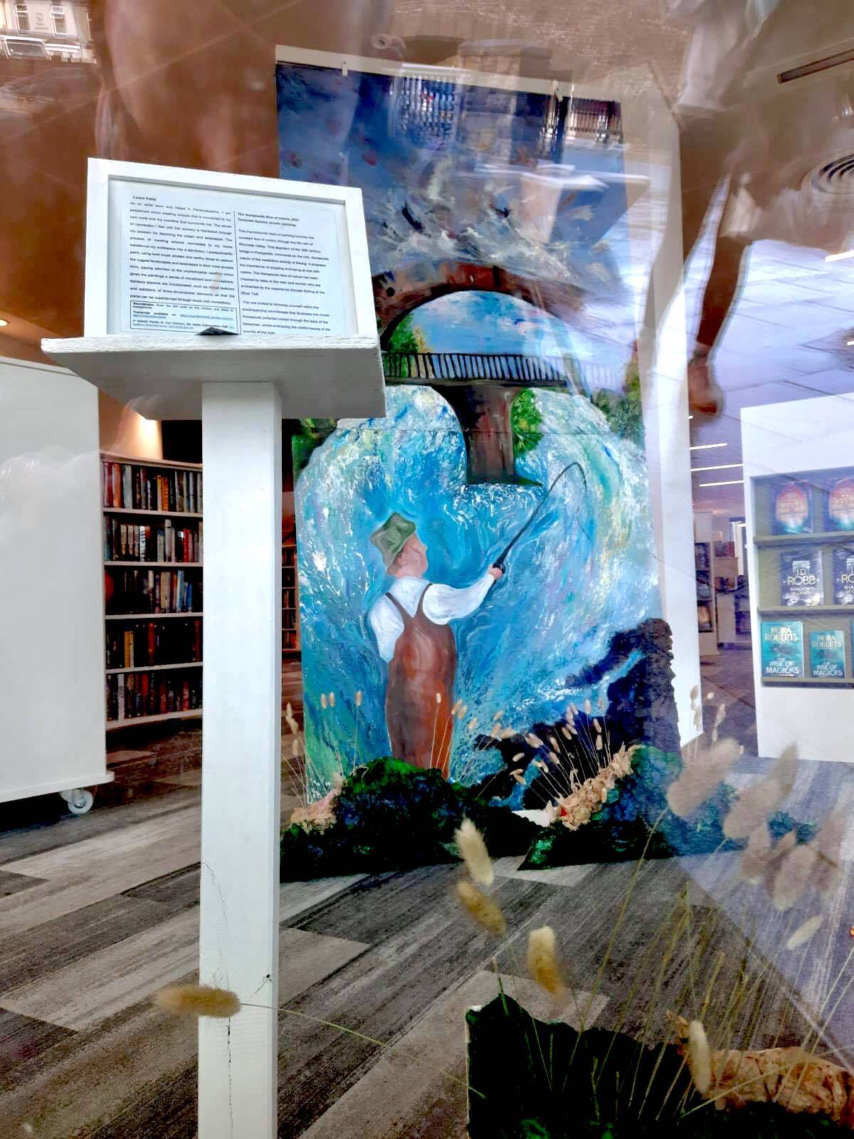 This impressionist style of painting involves the constant flow of motion through the life vein of Rhondda Valley. This depiction of the 18th century bridge in Pontypridd, comments on the rich, therapeutic nature of the meditative activity of fishing. It proposes the importance of stopping and being at one with nature. The therapeutic flow of nature has been inspired by tales of the men and women who are enchanted by the experience through fishing at the River Taff.