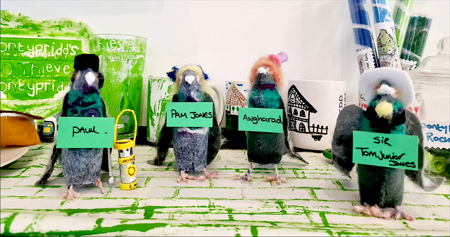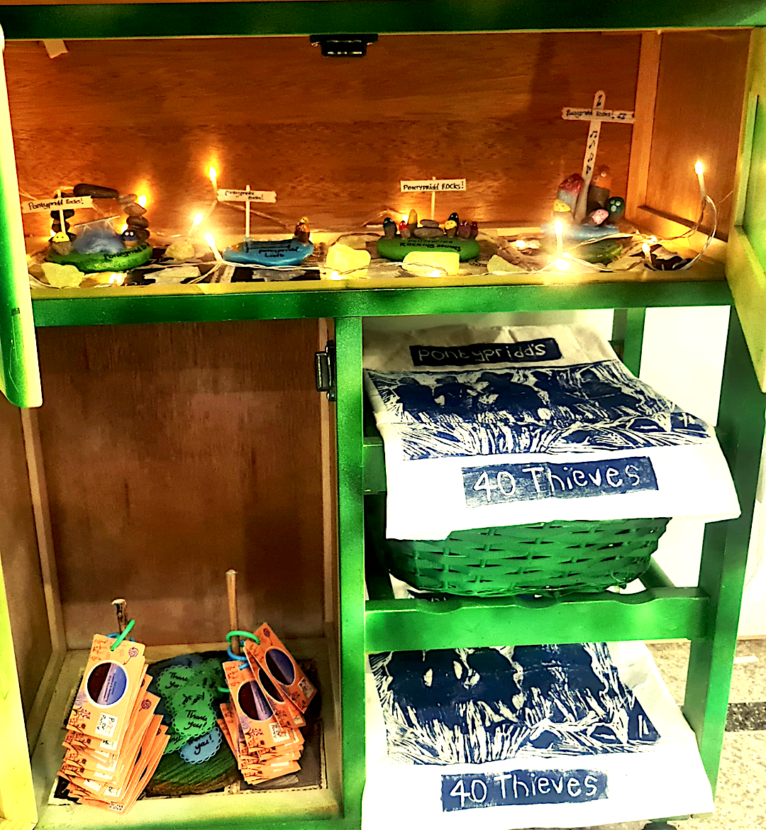 The ‘shop items’ are made using a range of techniques, such as lino printing, felting, paper craft, acrylic painting, clay work and working with sound. In addition, I have used both natural materials, such as pebbles foraged from the river banks of Pontypridd and charity shop treasure. It’s a natural part of my creative practice and identity to use these items as vehicles for telling ‘our stories’, our heritage and sense of place. Stories that inform this exhibit were collected from local people, students at the University of South Wales in Treforest, Pontypridd’s Historical Society, various Pontypridd-centric social media groups and research from sources such as radio interviews.