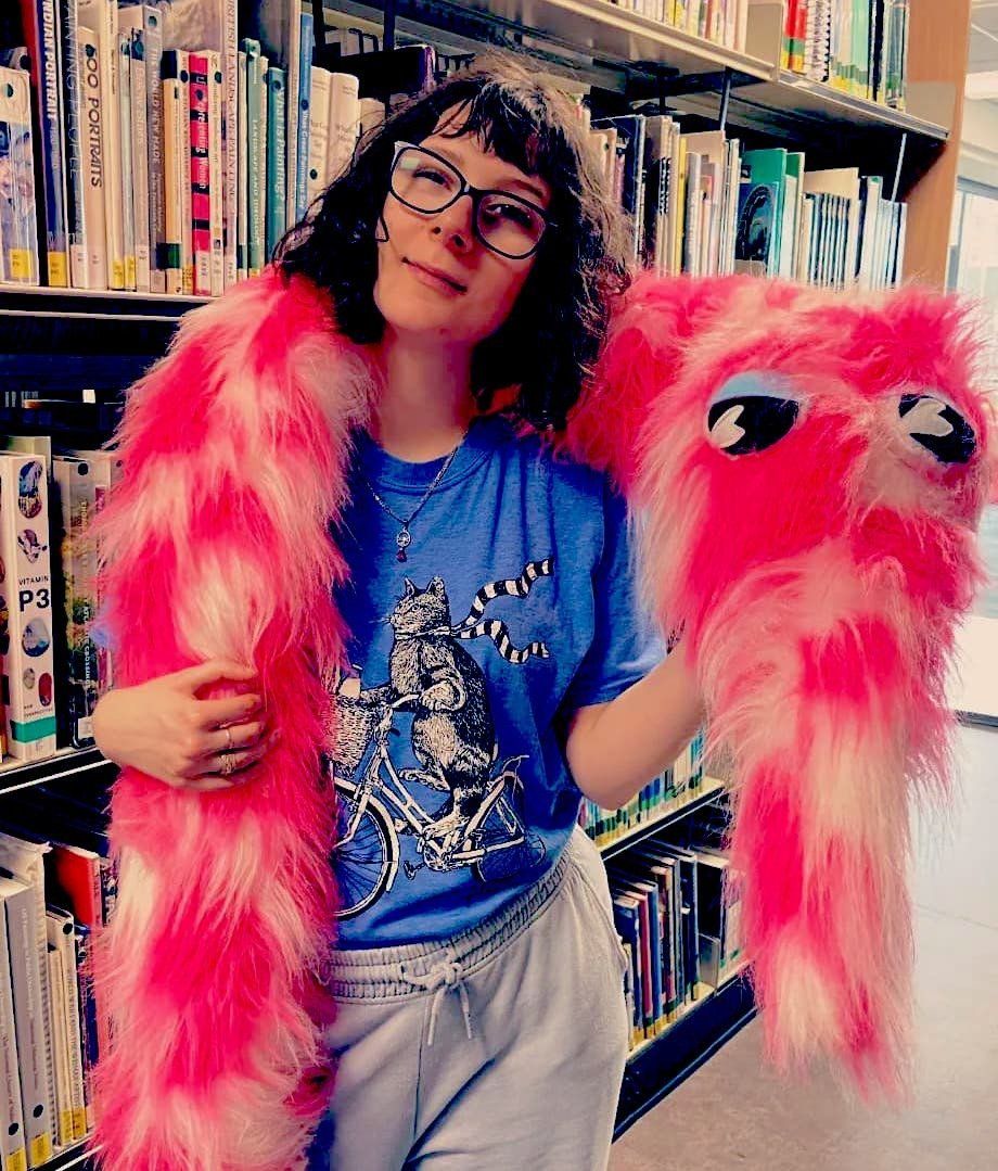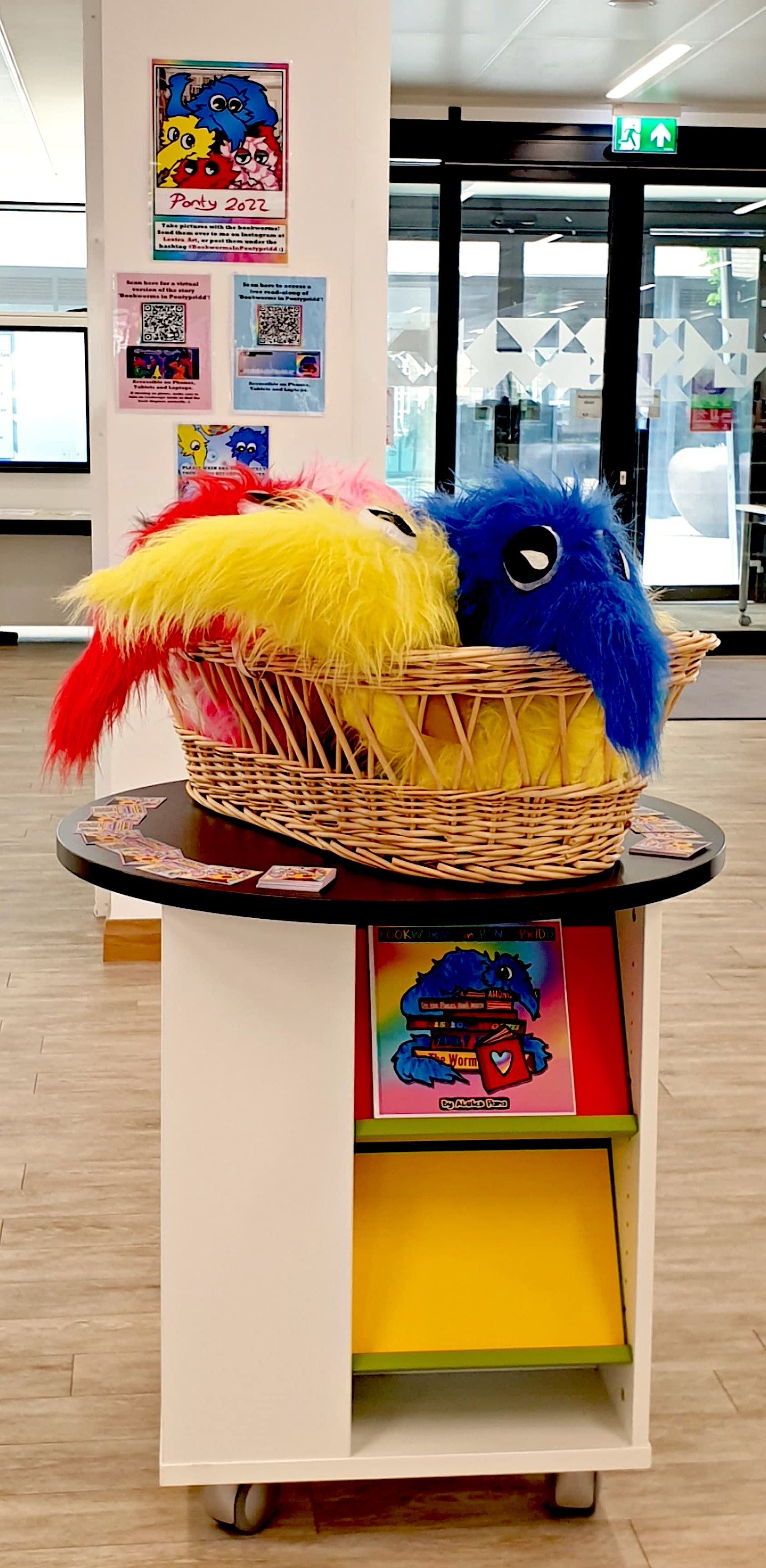 My work exhibited for the Art Trail, ‘Bookworms in Pontypridd,’ showcases four, extravagant, fluffy worms, intended to be reading buddies for younger library visitors - or simply for people who want something comforting with weight to hold in their lap or around their shoulders as they read. The goal is to encourage people to come to the library more often to meet these creatures and spend time with them all while discovering the power of books and stories. Meanwhile, the accompanying book about the ‘Bookworms of Pontypridd’ serves as a way to give the bookworms character and help the reader create a better connection with the bookworms. Additionally, to promote inclusivity and help everybody to experience the books, there is an audio read-along of the book that can be easily accessed through a QR code, along with a separate QR code that links to an online version of the book. Library visitors are invited to hold, hug, and take pictures with the bookworms, and are highly encouraged to send me photographs via my instagram, @Lextra_Art or post them to your own Instagram, using the hashtag #BookwormsInPontypridd.