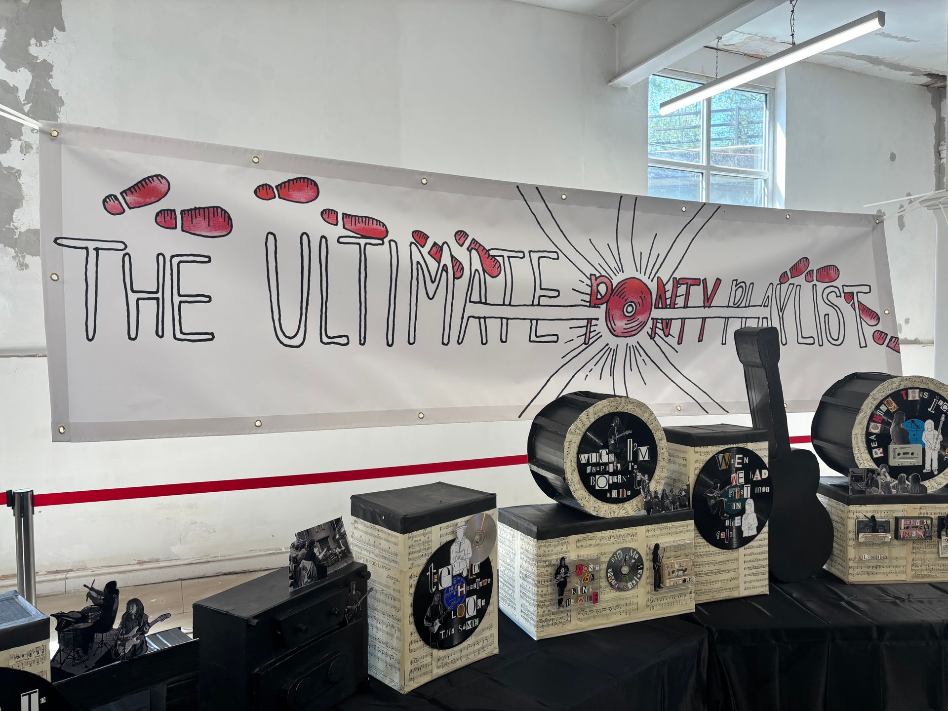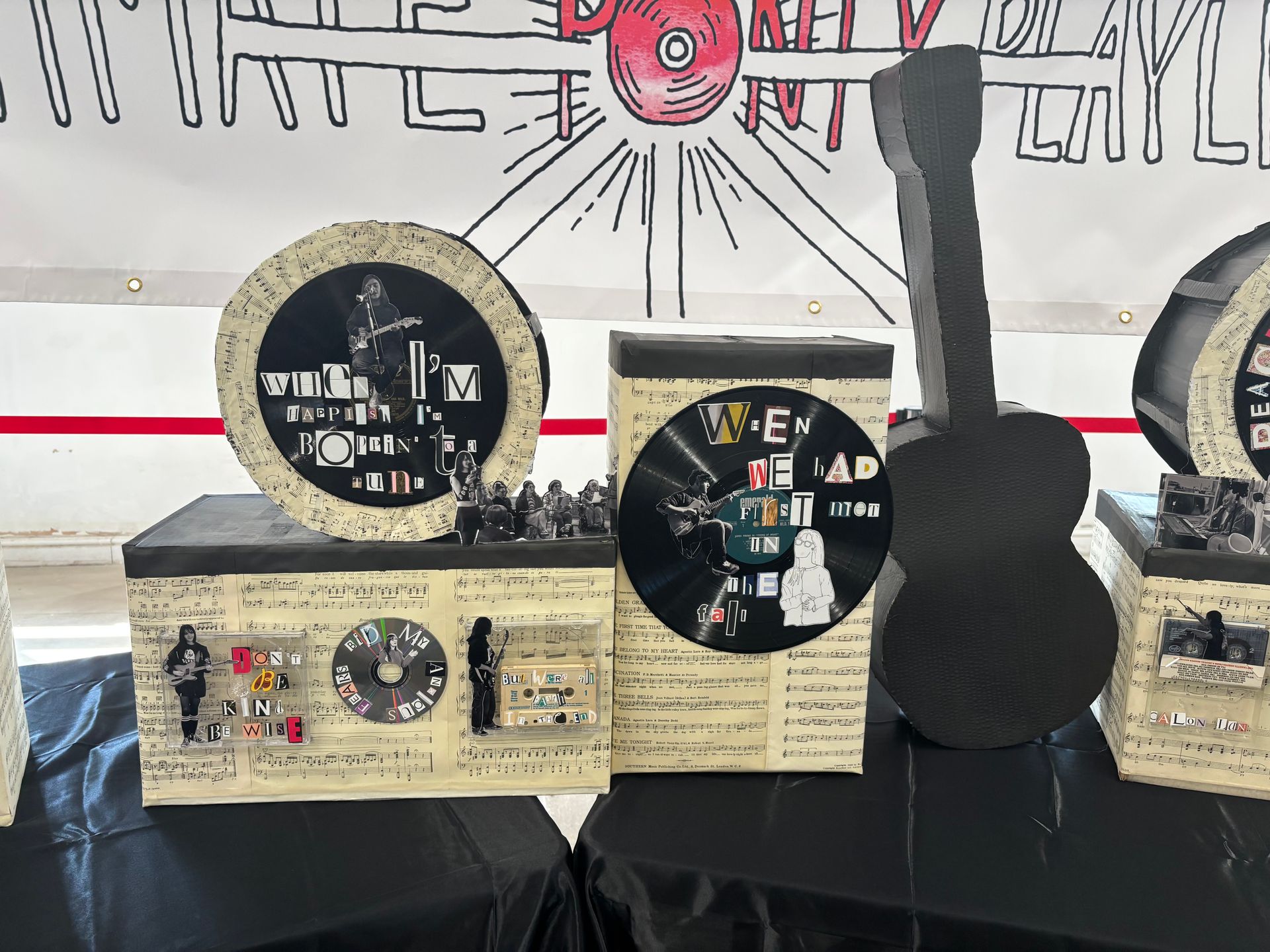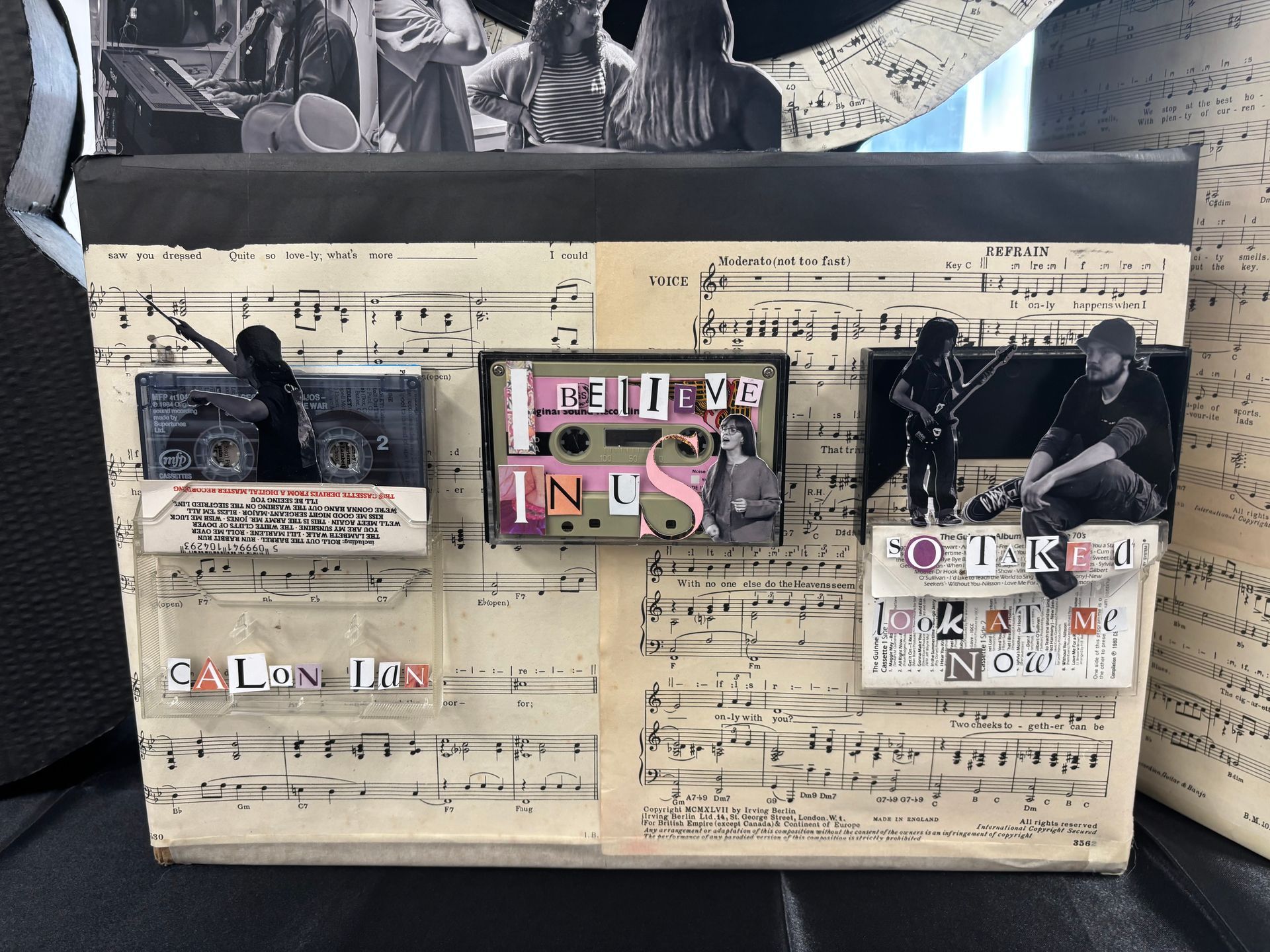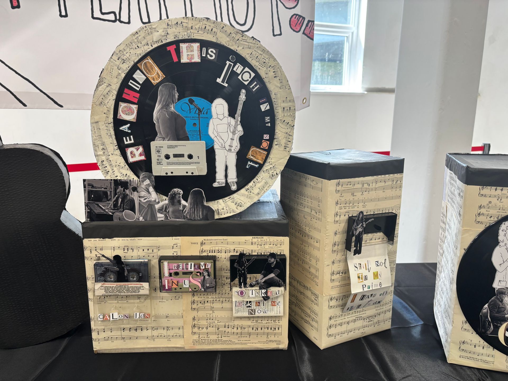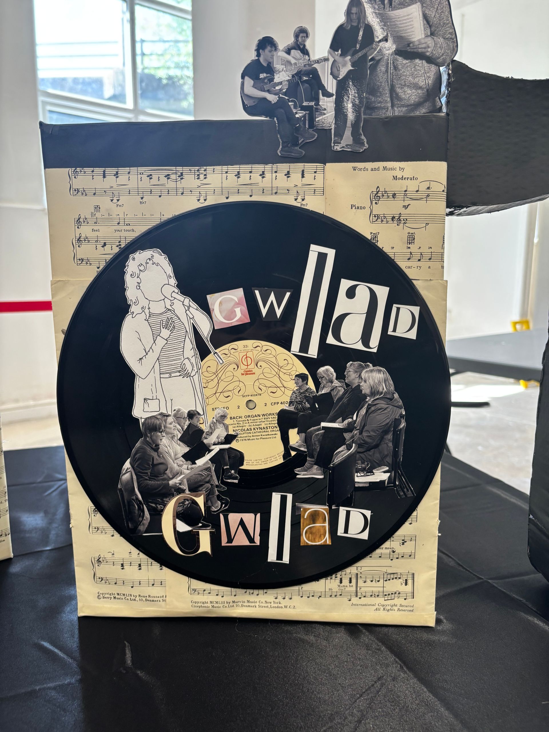 I decided to do this project because this is ‘The Land of Song’. Music is such a big influence for people. I feel as though I needed to do this project because I was curious on how the community would engage. I would have to go out into the community, put myself out there and meet new people to achieve the hopeful outcome of a rich playlist of songs to influence the artwork I was going to create to reflect that passion. ‘The Ultimate Ponty Playlist’ is made up of an audio recording of participants telling us about a song that reminds them of Pontypridd and why. This will be played in the background alongside cardboard structures that I've created with musical motifs that stand as the mounts for the artwork I've reflected on with this project with. Records, CD’s and cassettes all hold the lyrics of the songs I was presented with. I have also incorporated photos and fine line drawings highlighting The University of South Wales Music Society, Olive Attic and The Pontypridd Community Choir who allowed me into their space and helped to add richness to this project.