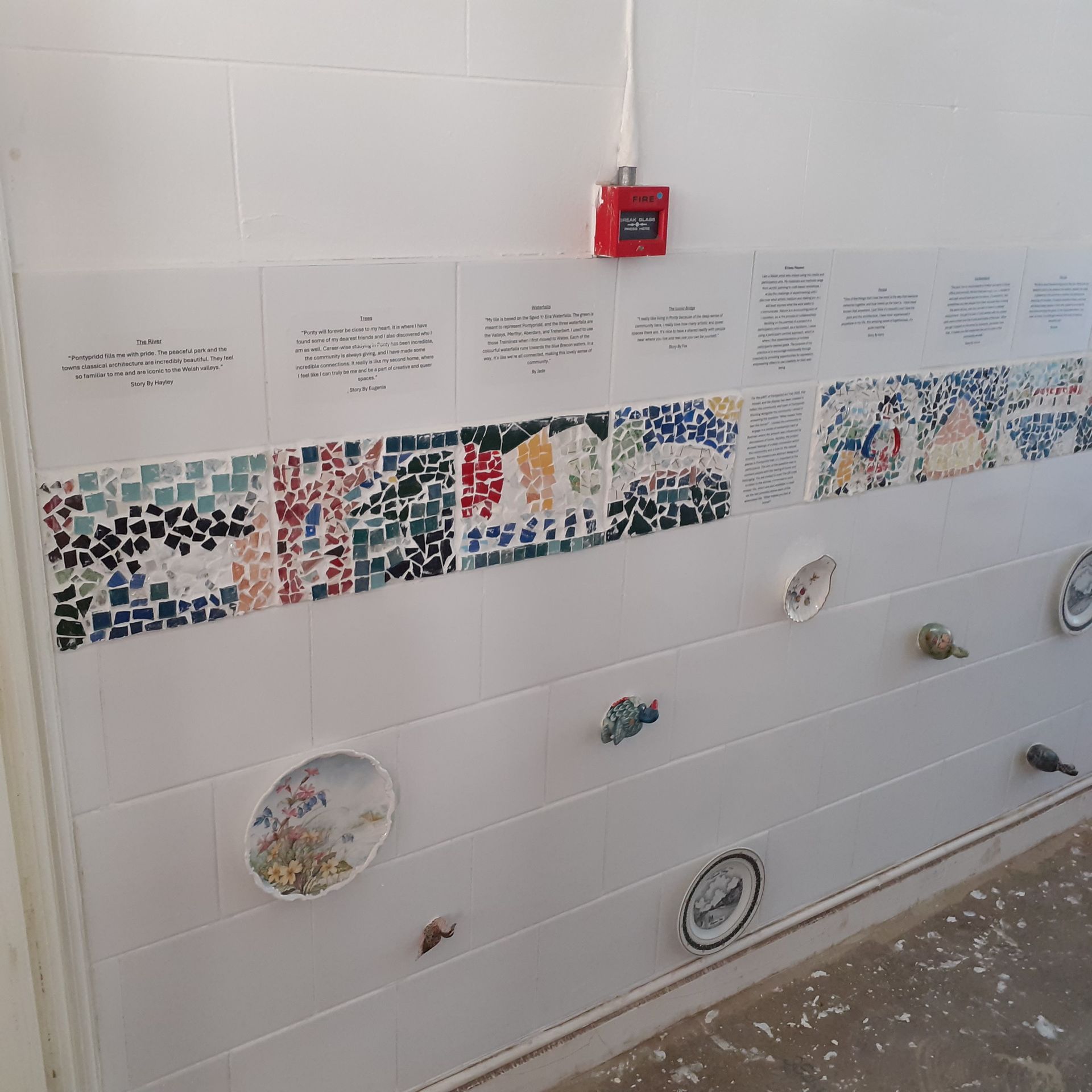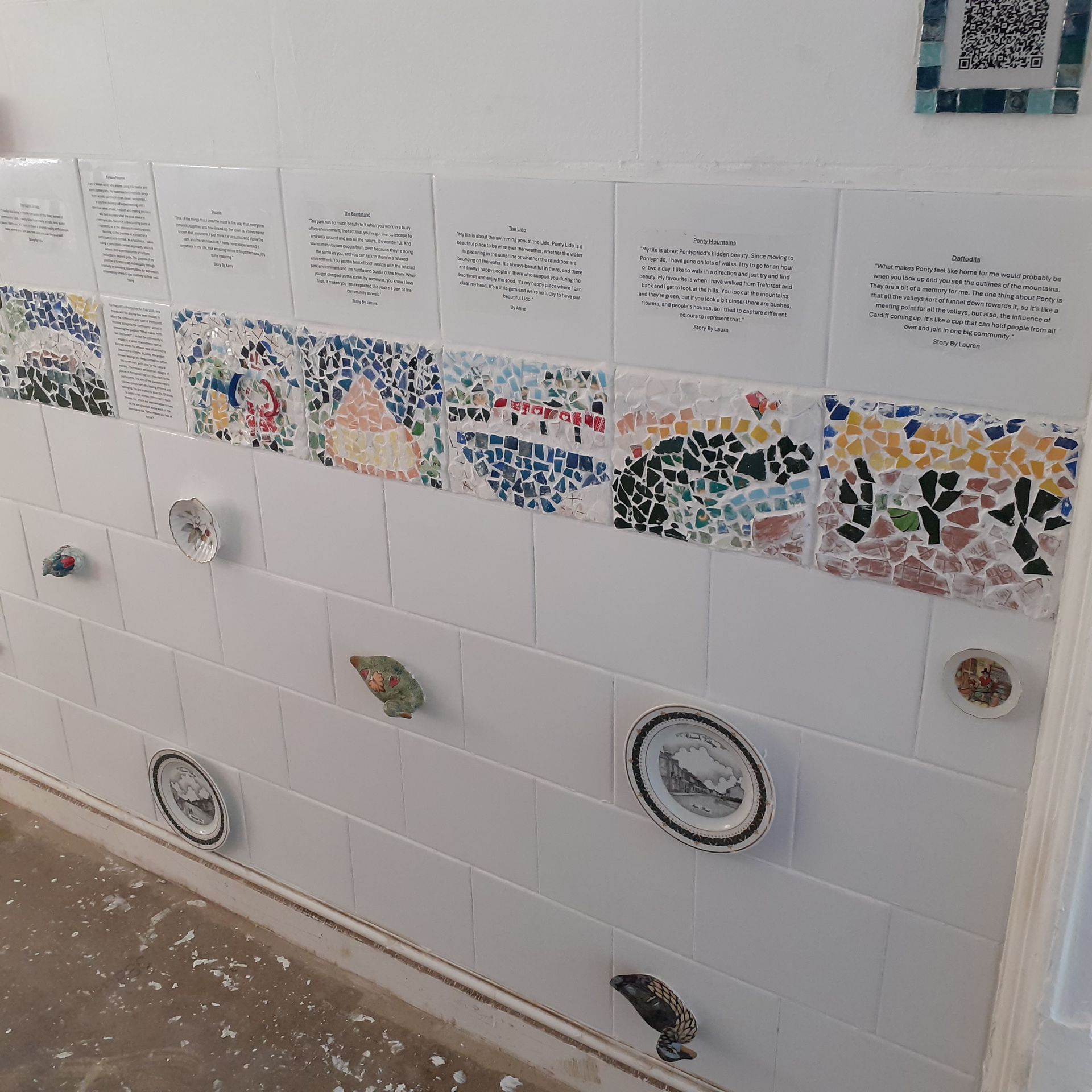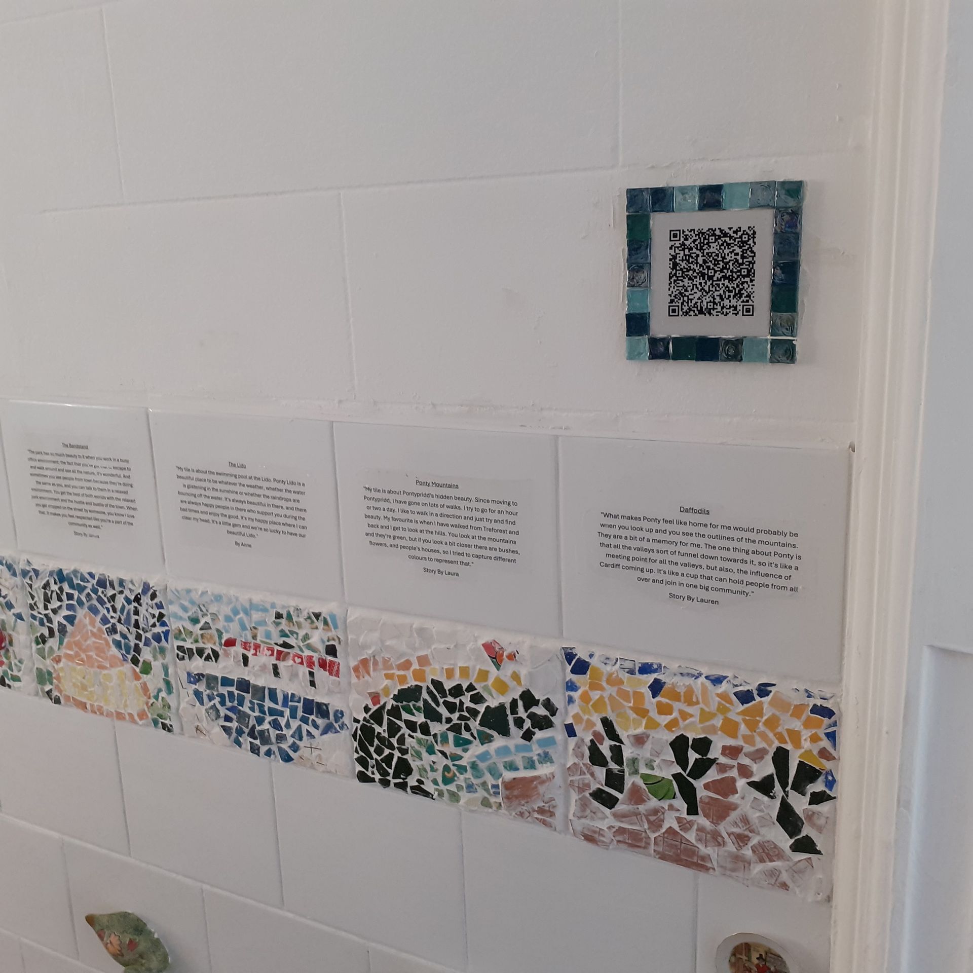 For the pART of Pontypridd Art Trail 2025, this mosaic and tile display has been created [BD1] to reflect the community and town of Pontypridd. Working alongside the community I aimed to answer the question “What makes Ponty feel like home?”. I invited the community to engage in a series of workshops held at Badman where the artwork was influenced by discussions of home. Notably, the project showed feelings of a deep connection within the community and a love for the natural scenery. The mosaics are abstract designs of places in Pontypridd that are important to the participants. The aim of the question was to connect people with the feeling of home and belonging. You are invited to scan the QR code to listen to the stories connected to each mosaic tile, which are also available to read via the text provided above each of the associated tile. ‘What makes you feel at home?’.