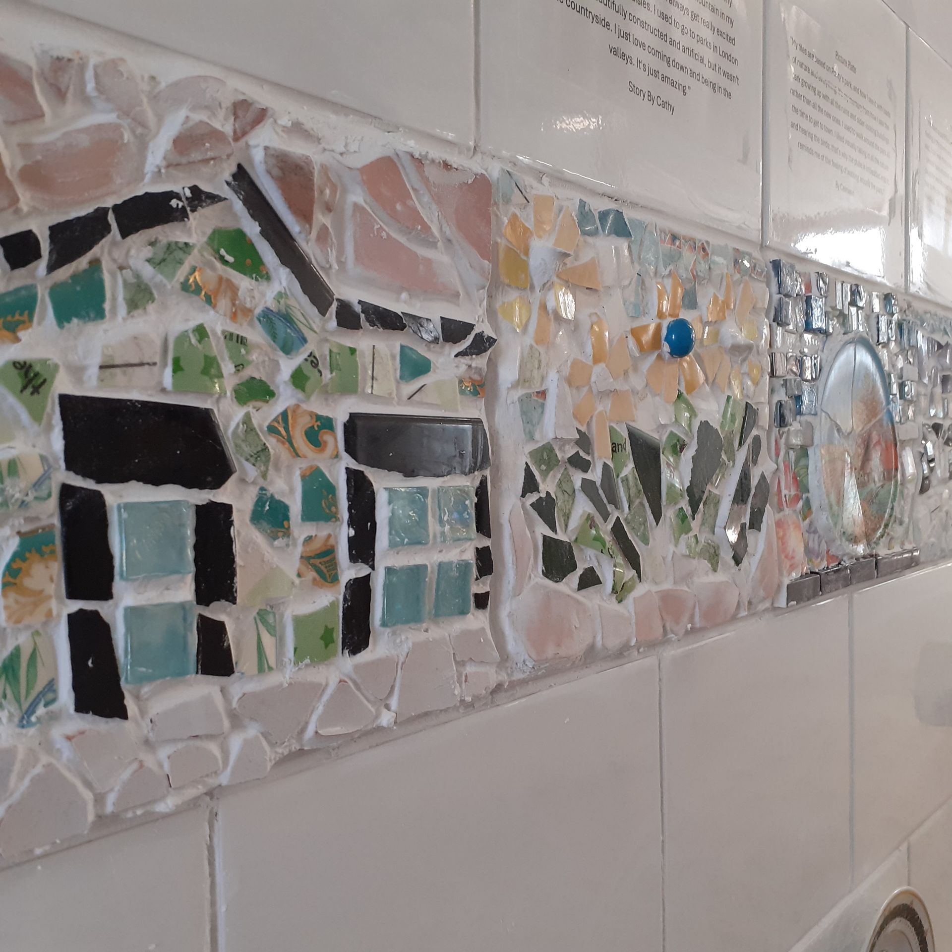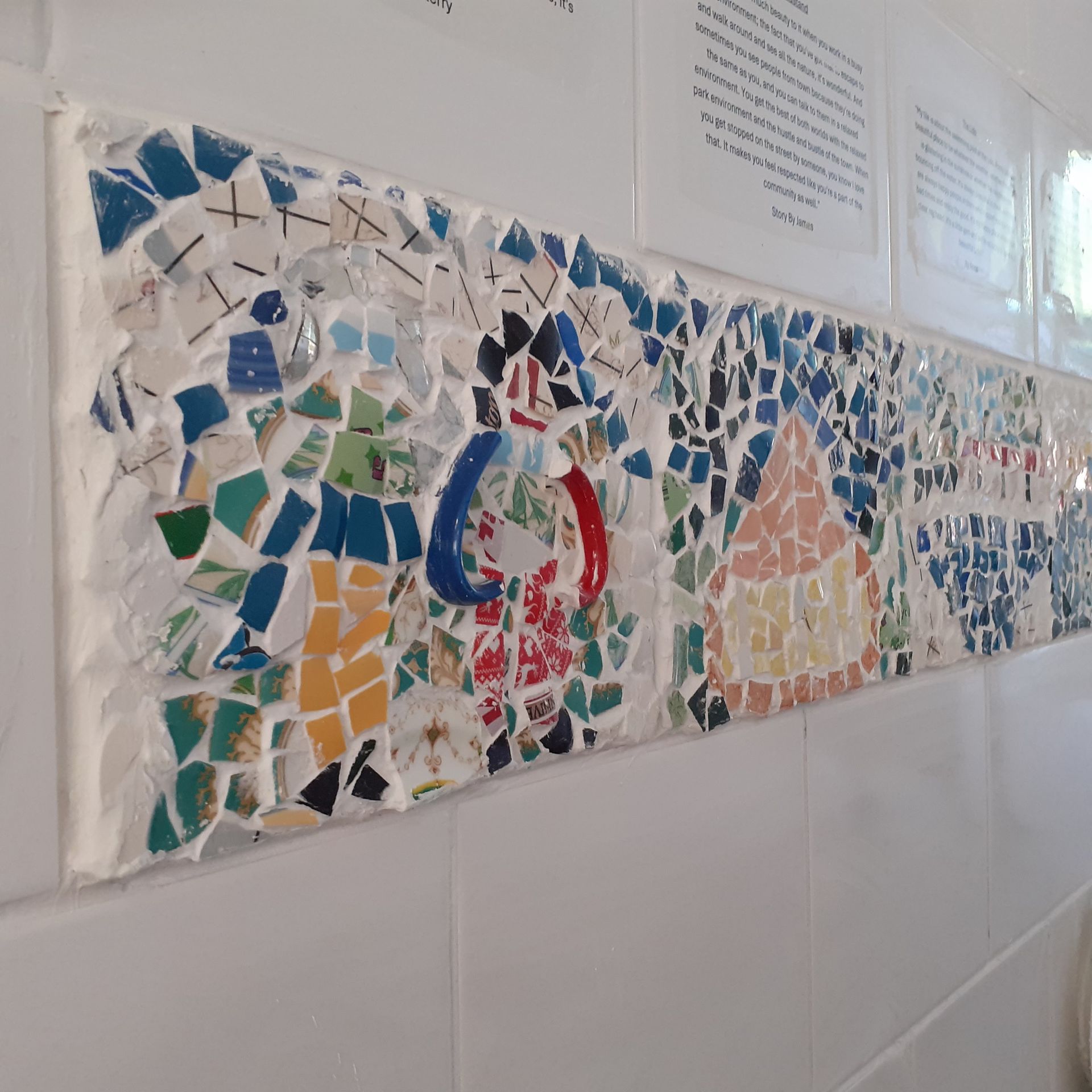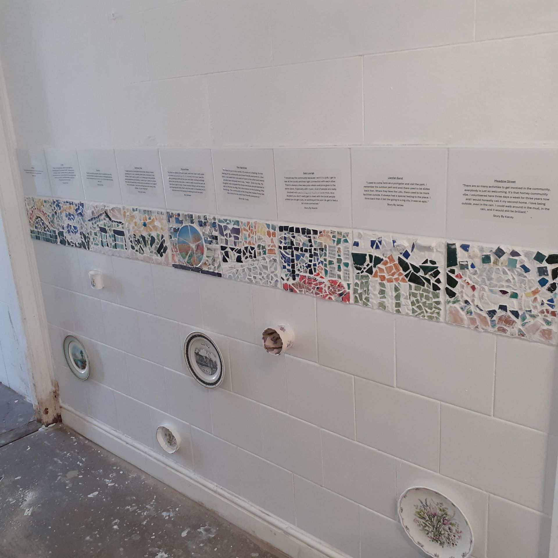 For the pART of Pontypridd Art Trail 2025, this mosaic and tile display has been created [BD1] to reflect the community and town of Pontypridd. Working alongside the community I aimed to answer the question “What makes Ponty feel like home?”. I invited the community to engage in a series of workshops held at Badman where the artwork was influenced by discussions of home. Notably, the project showed feelings of a deep connection within the community and a love for the natural scenery. The mosaics are abstract designs of places in Pontypridd that are important to the participants. The aim of the question was to connect people with the feeling of home and belonging. You are invited to scan the QR code to listen to the stories connected to each mosaic tile, which are also available to read via the text provided above each of the associated tile. ‘What makes you feel at home?’.
