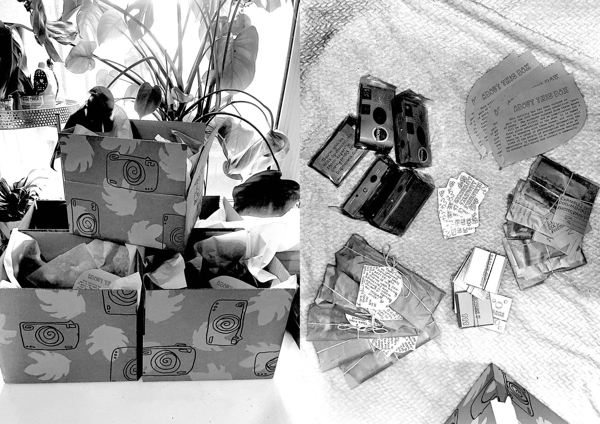 My project for the Art Trail has created in partnership with members of the community of Pontypridd. Over the past month, project participants have been gifted an activity box containing a disposable camera and series of prompts to capture moments in their everyday lives. Alongside their resulting photographs are a series of my own photographs taken around Pontypridd. I have titled the project 'The Perception of Time' as it displays moments captured in the past whilst simultaneously disputing the concept of moments ever existing in the ‘past’, instead asserting the notion that moments in fact only ever exist in the present and whilst we are actively being present. Fragments of the photographs contain mirrors that reflect us so that we are indeed present in the moment of the image.  Quotes that inspire the importance of remaining present by some of my favourite authors are displayed alongside the photographs in gold dymo label tape.  In addition, a series of sound recordings are provided, short tracks that were recorded during the very moments these photographs were captured.