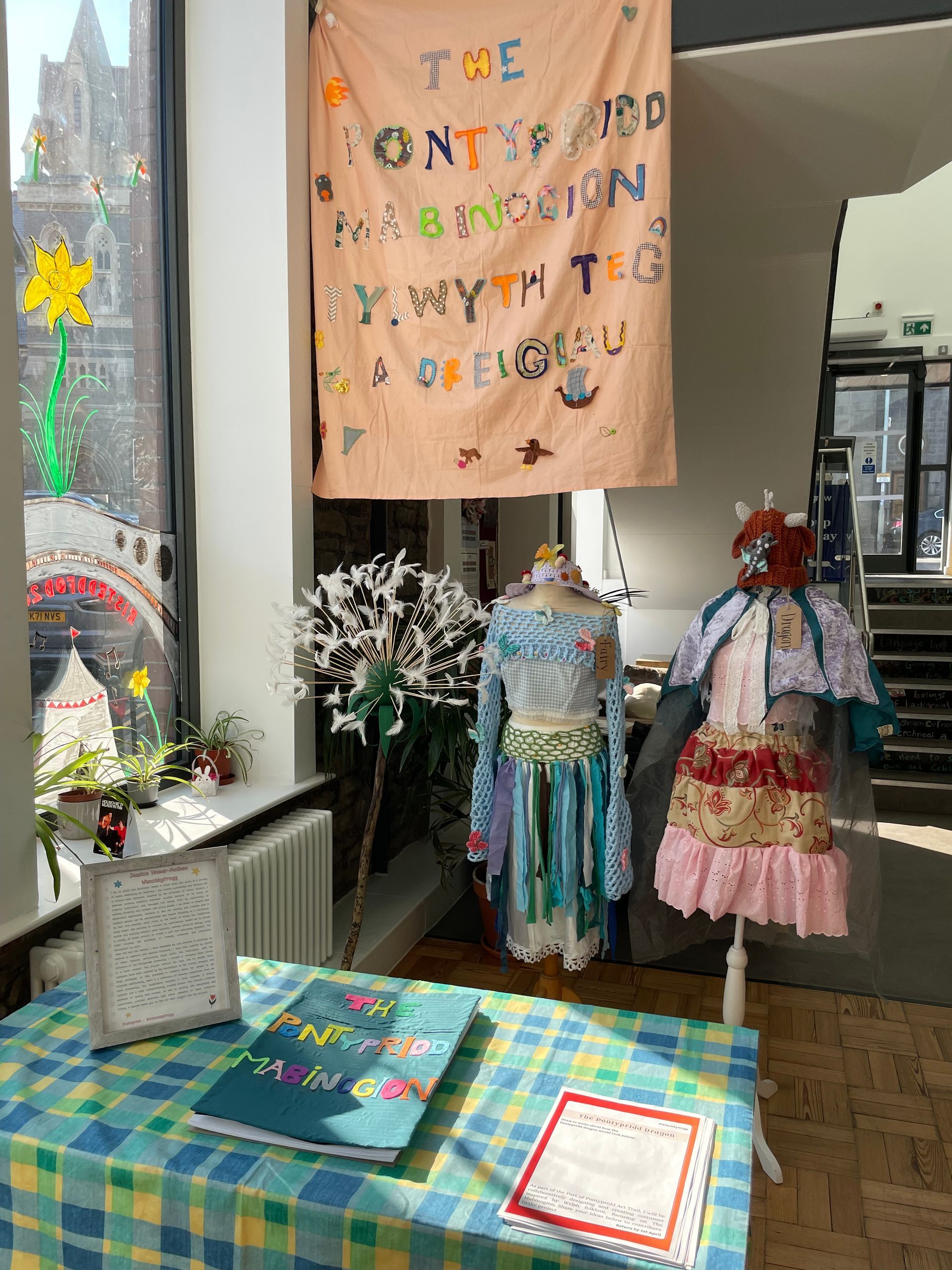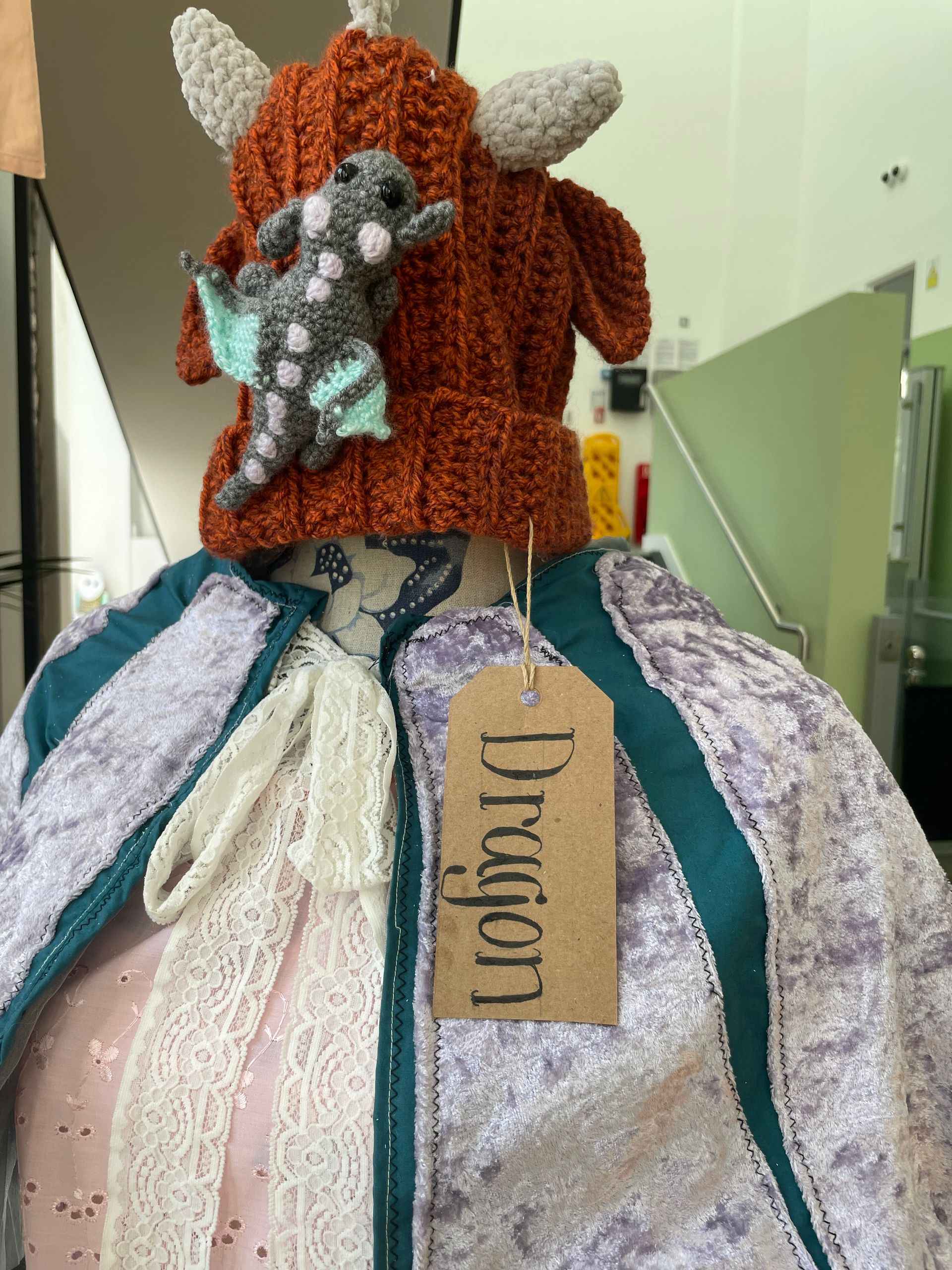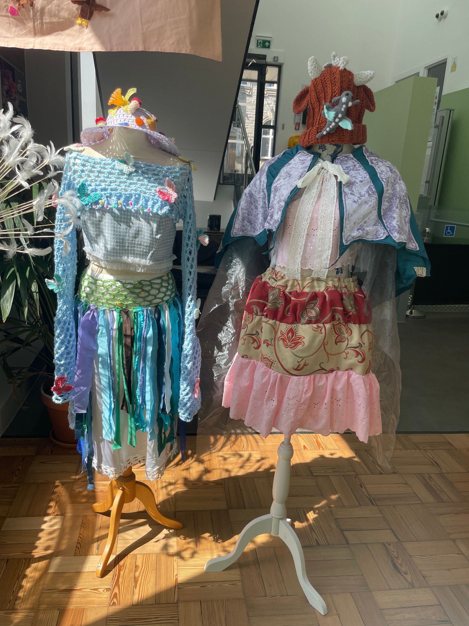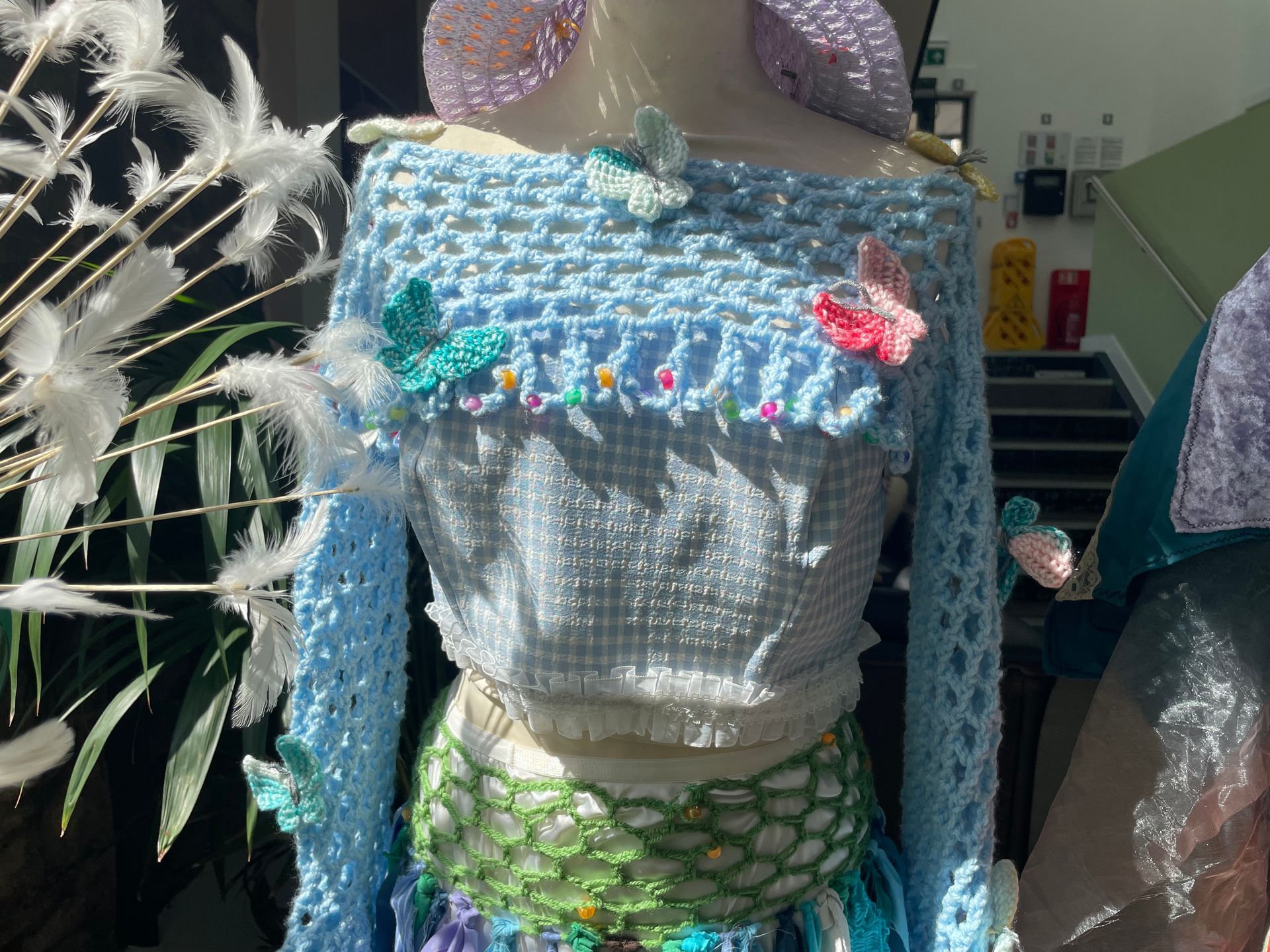 Over the last few months, I have embedded my arts practise in exploring my interest in mythical and magical creatures. I have been inspired by stories of Welsh folklore, particularly those within The Mabinogion. With the influence of the Pontypridd community, I wanted to reimagine these stories in a local context. This project reflects the town and its people. These costumes have been inspired by the facilitation of the ‘Fairies, Dragons and Kings Workshop’ at YMa, providing a creative space for people to get involved. Additionally, there is a collection of drawing submissions from the local community. This installation includes a fairy costume, a dragon costume and a large collaboratively created banner. This artwork combines elements of sewing and crochet. As well as working with repurposed and sustainably sourced materials that drove elements of these creations. Finally, a special thank you to YMa for their support with this project.