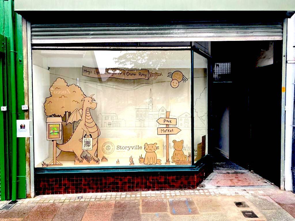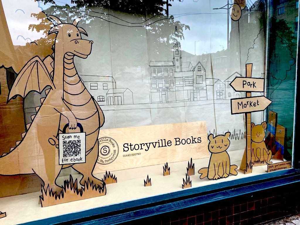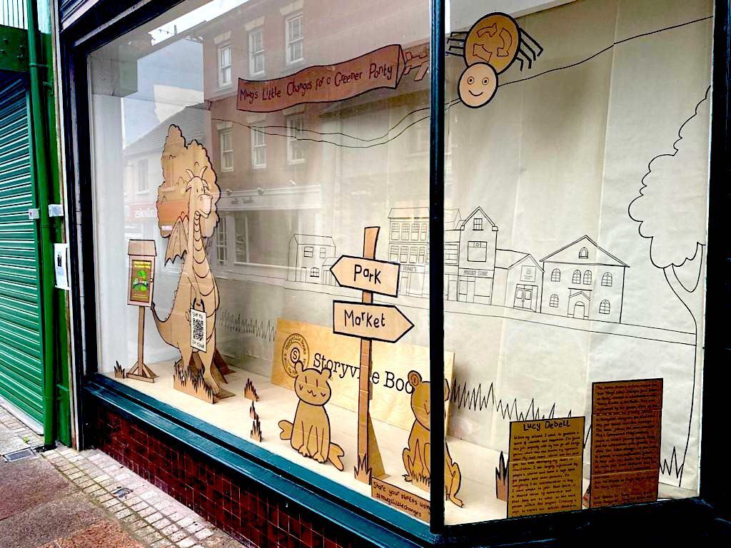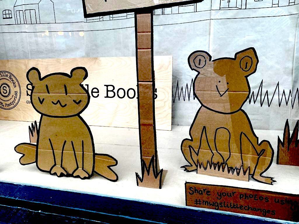 The window display for the Art Trail is a celebration of the book ‘Mwg’s Little Changes for a Greener Ponty’, created in collaboration with Young Friends of the Earth, Pontypridd. This book was directly informed by the group’s ideas for ways we can be more eco-friendly, specifically in Pontypridd, with characters they felt should voice this message. The book follows the main character, Mwg, (pronounced “Moog”, meaning ‘smoke’ in Welsh), on her journey around Ponty, and her interaction with friends that, in-turn, demonstrate the little changes we can make to promote a more sustainable future. In-keeping with this theme, the window display is completely made with used cardboard sourced from local independent businesses.
