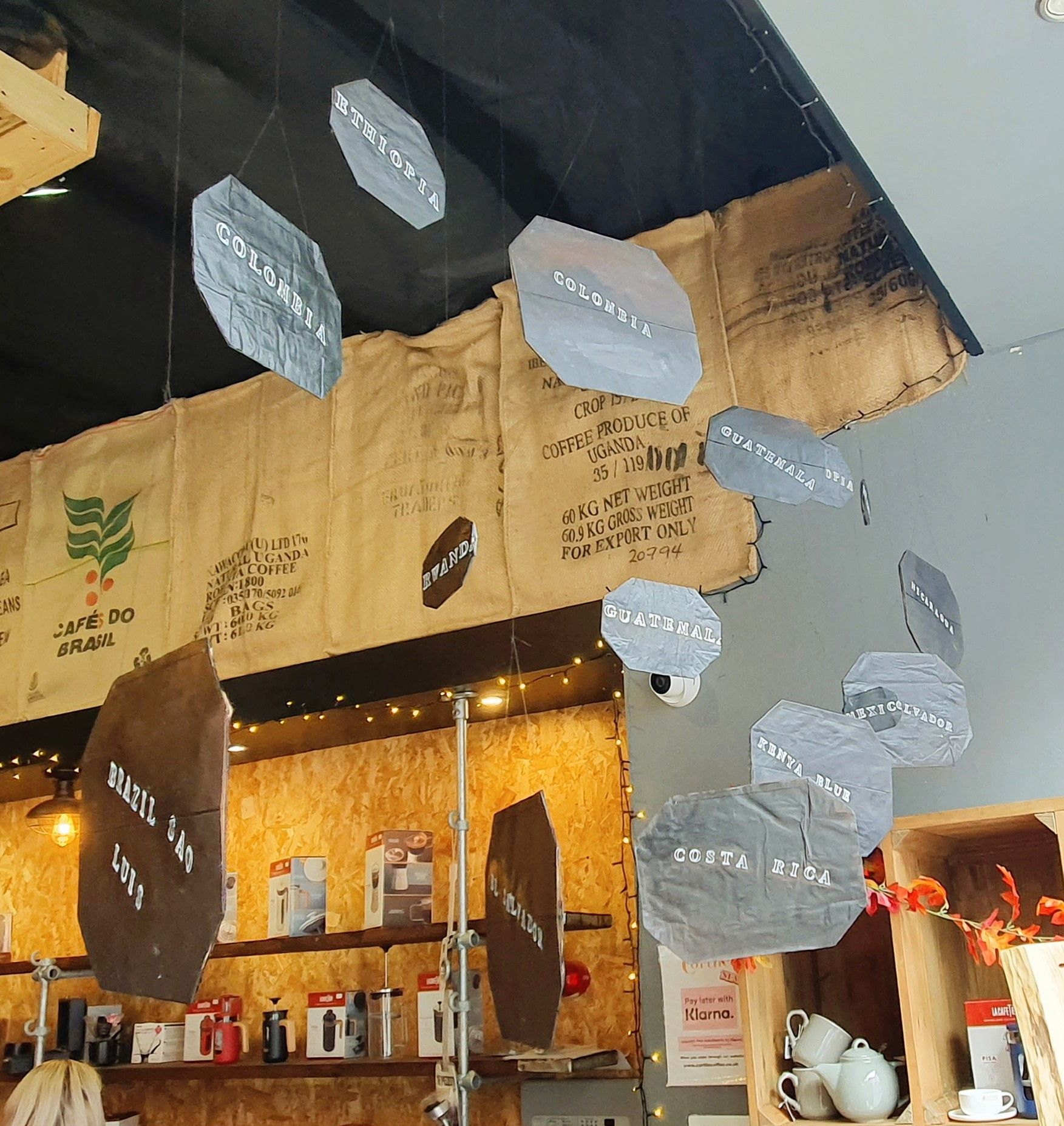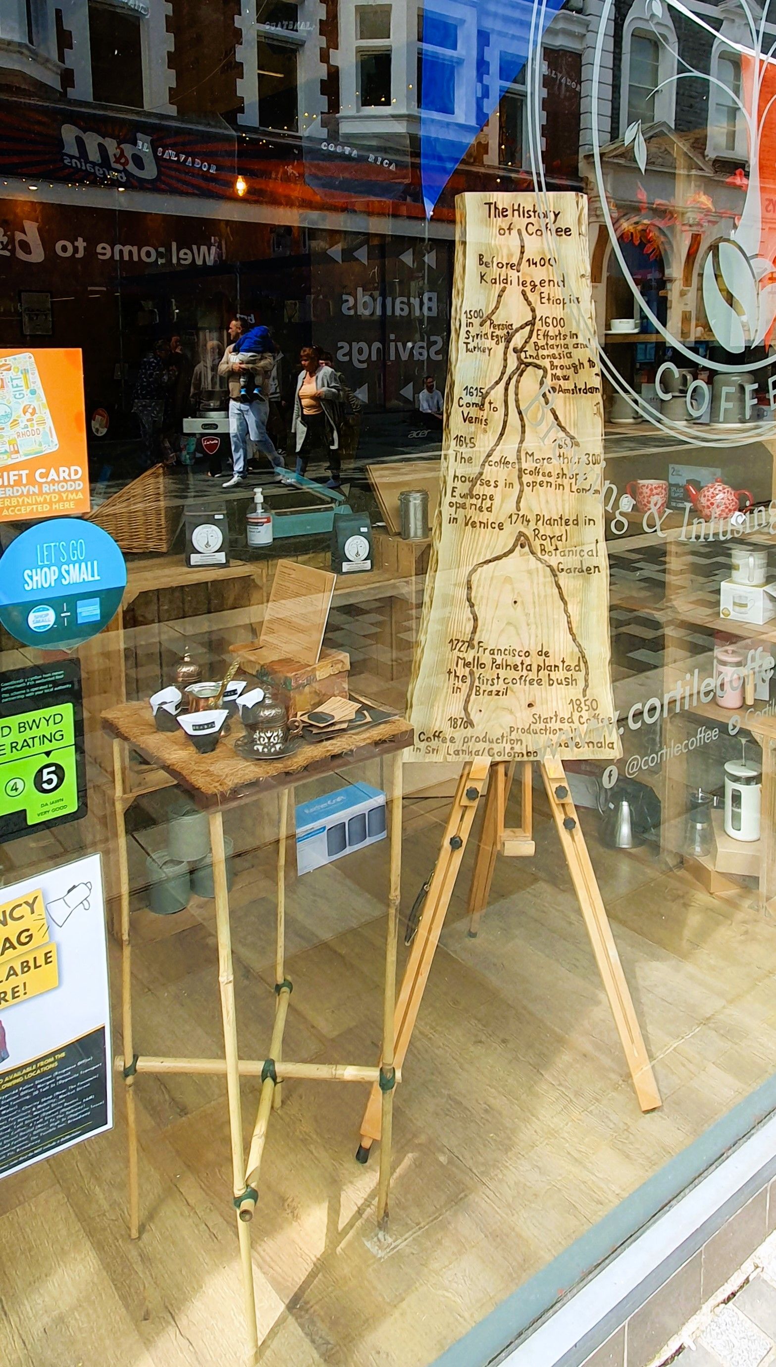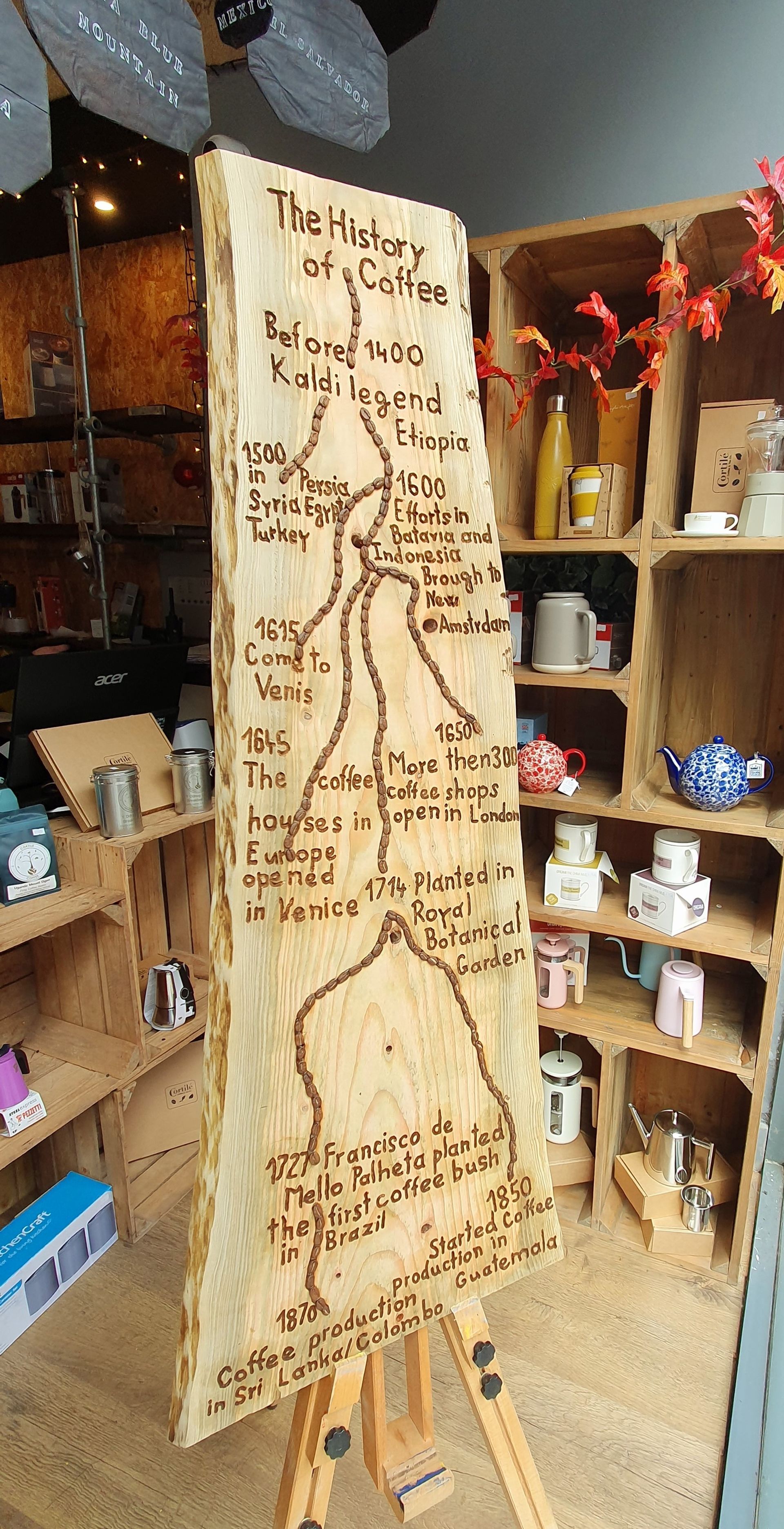 I have created a timeline, "The History of Coffee," for the world using origami beans for the business card, making origami beans for hanging in the store and decorating the wood slice with coffee beans and pyrography techniques. Coffee beans have influenced scent and history in the entire world across art and politics. Also, coffee beans have been interesting across different generations worldwide, and traditional habits continue with the coffee culture.